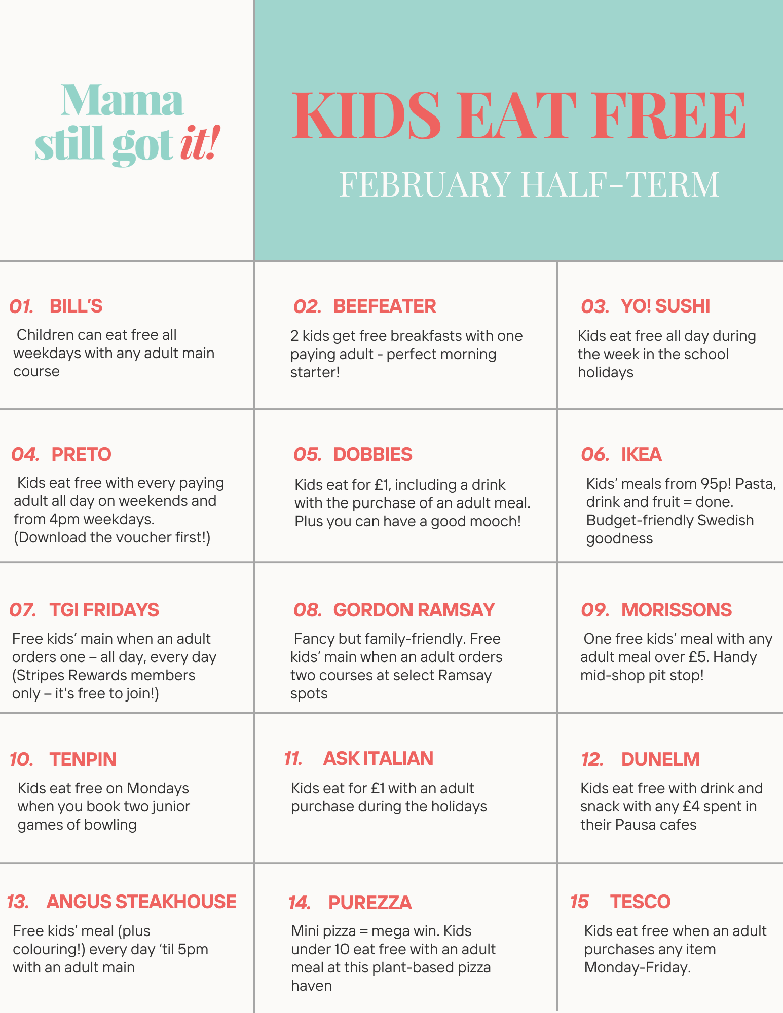 Half-term plans are one thing⌠feeding everyone is another. The good news? Plenty of places are running kids eat free (or cheap) deals this week. Save this to your phone or share on your WhatsApp groups!